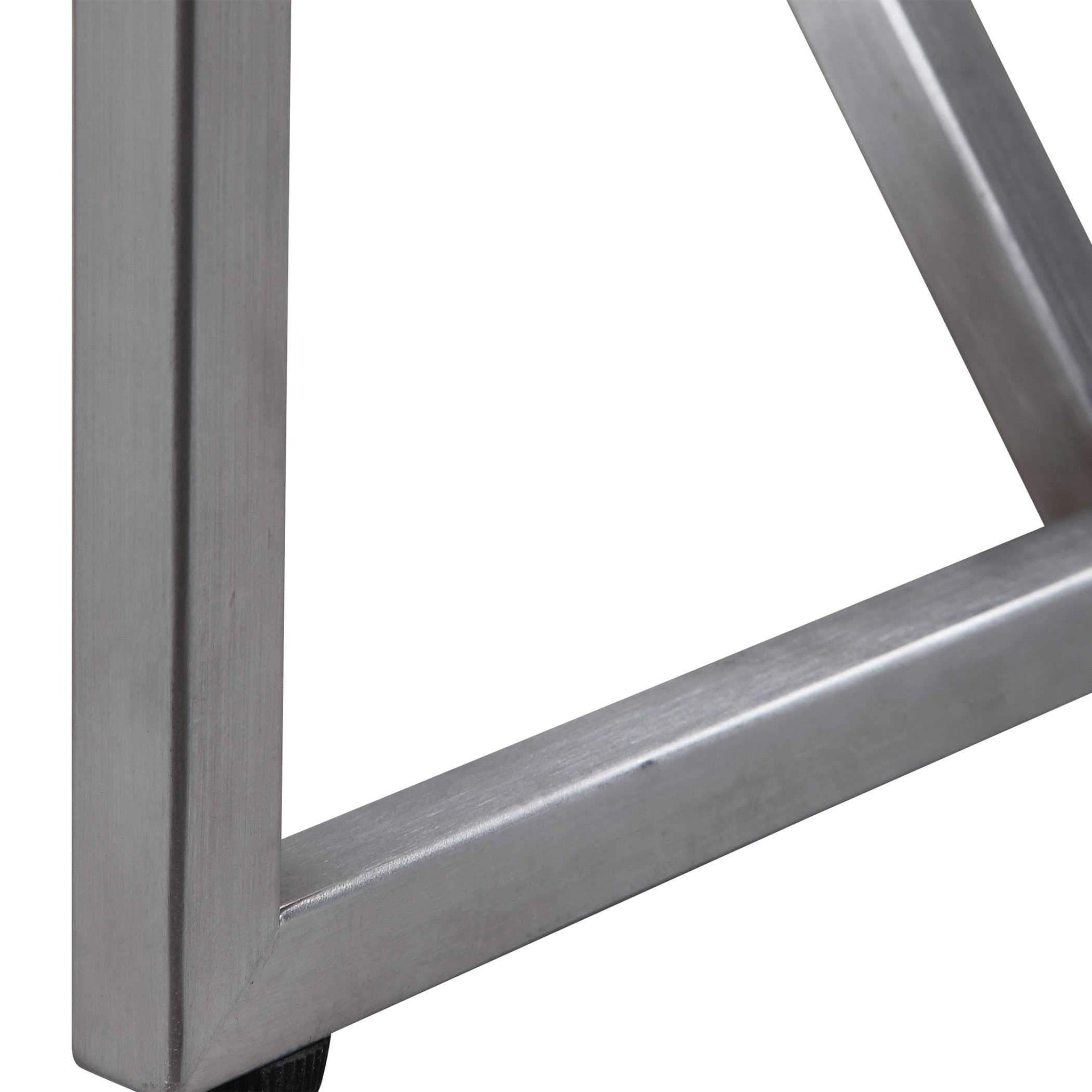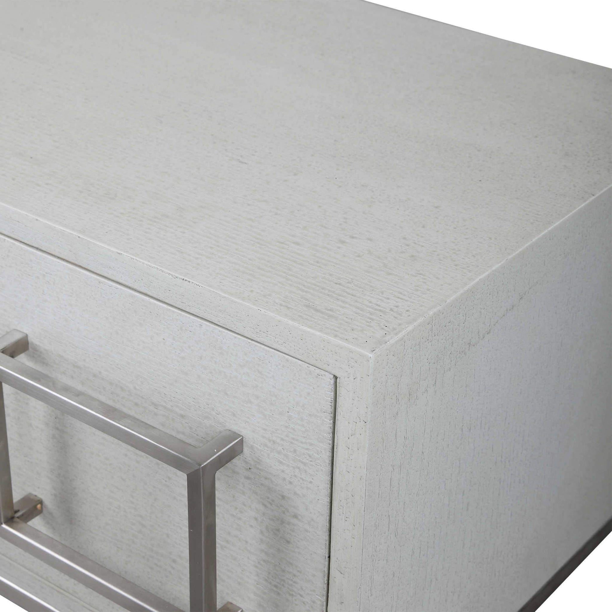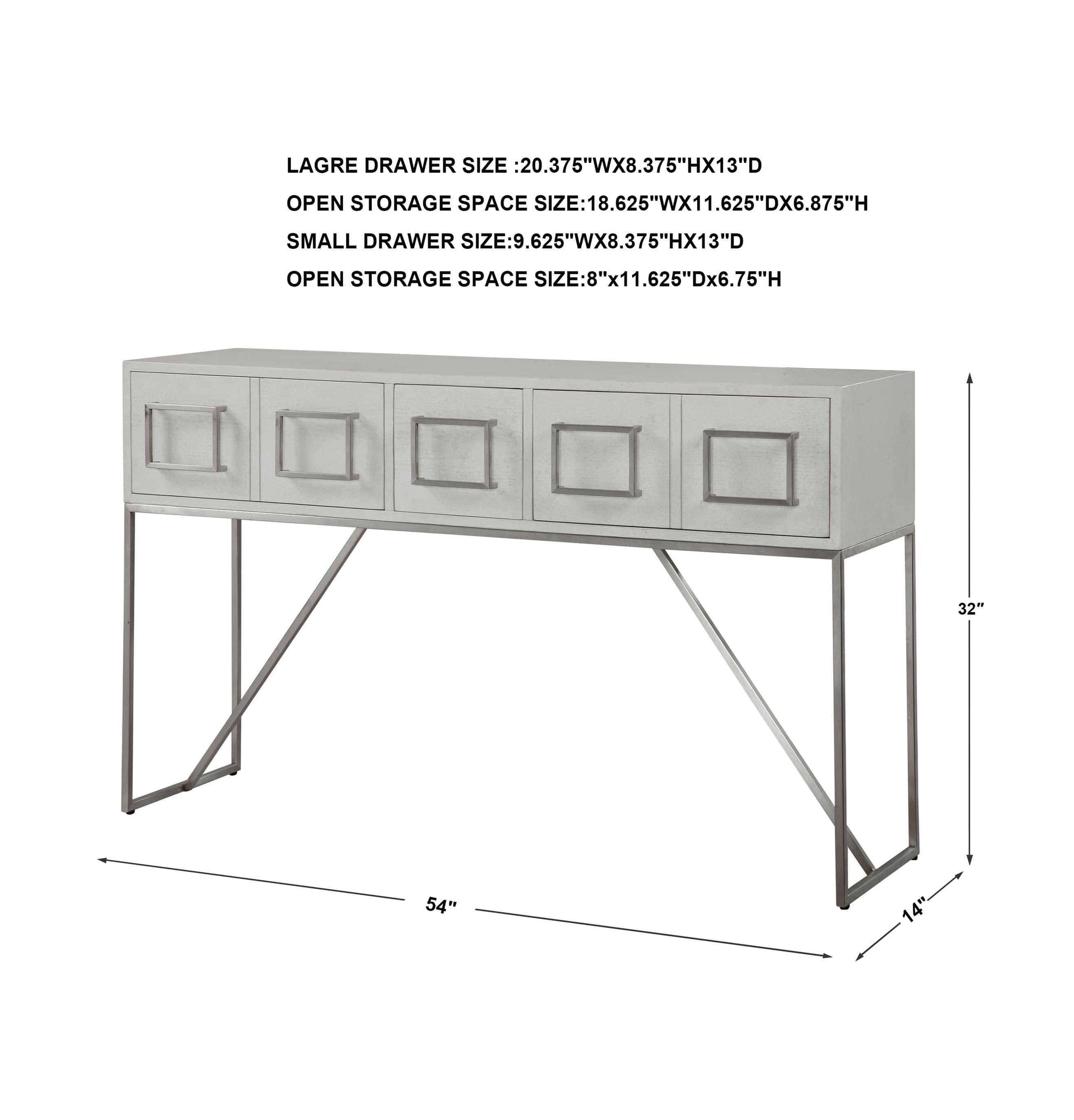 This console table is a clean contemporary styling, featuring oak veneer finished in a soft white with light gray distressing. Accented with statement hardware in brushed nickel stainless steel with a coordinating base. Has two double drawers and one single drawer in the center.