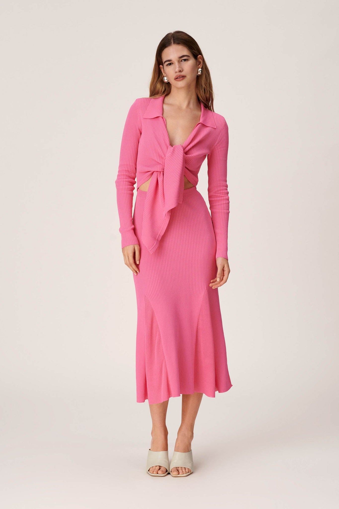 Knitted Riviera dress in pink. The dress is rib-knitted and has full length sleeves, a V-shaped neckline with collar and a waist cut out detail with a tie band ending to adjust the fit.
