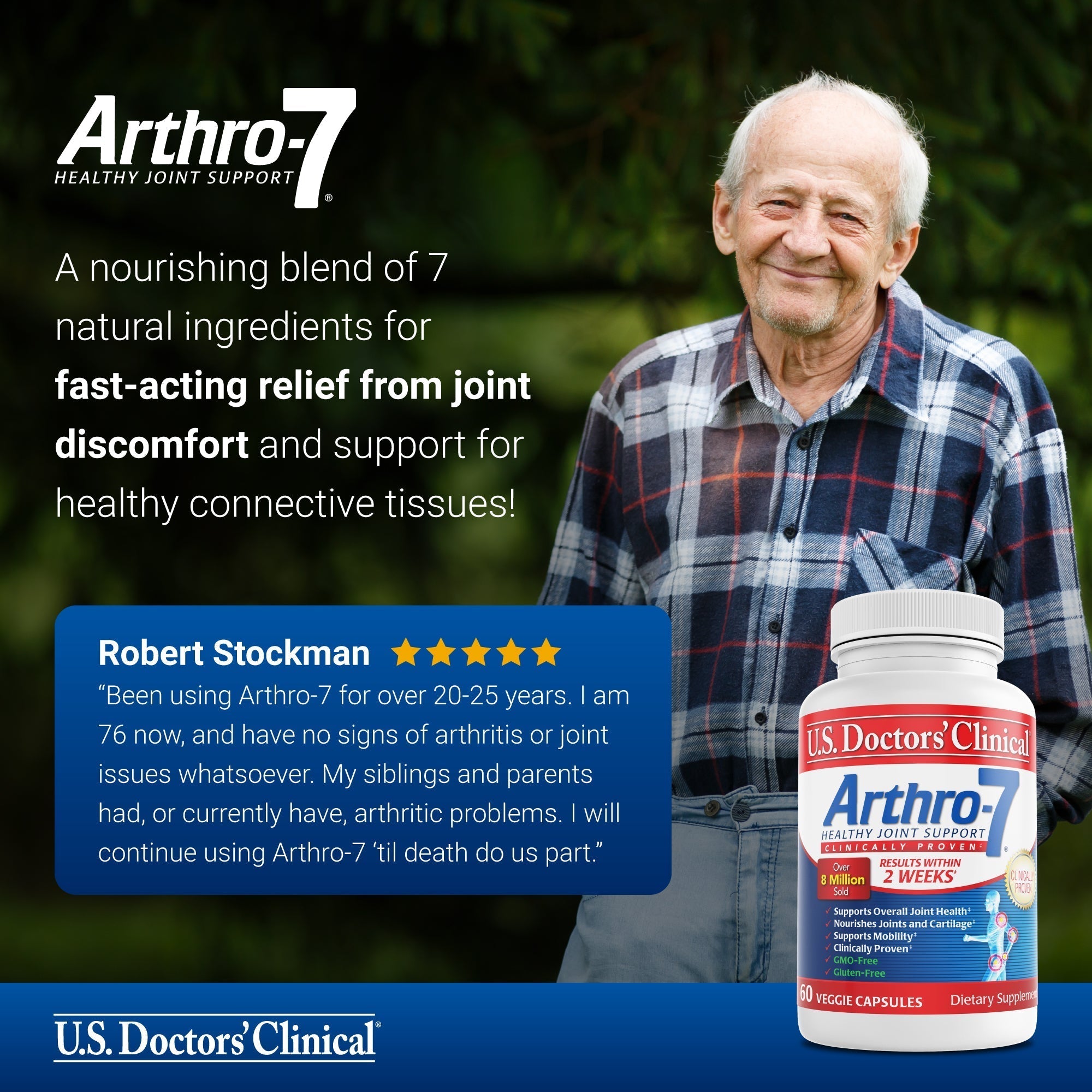 More than 50 million Americans deal with joint discomfort and other conditions affecting their mobility. If you’re one of them, or if you’re simply interested in maintaining everyday joint health, try Arthro-7® Risk-Free (60-Day Money-Back Guarantee) and see the difference it can make to your quality of life.