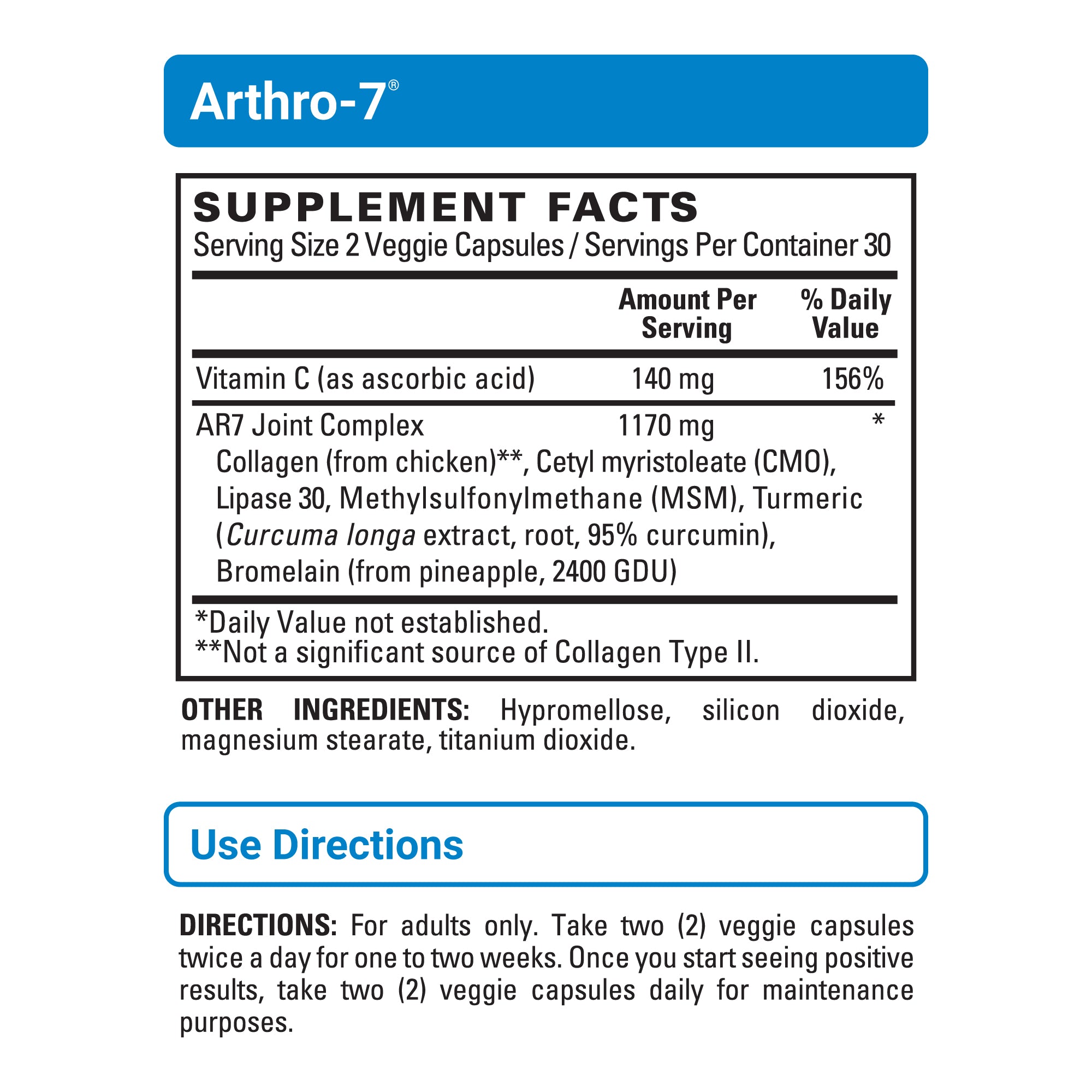 Clinically proven to improve joint comfort and range of motion in as little as two weeks, Arthro-7 is a proprietary blend of seven specially formulated ingredients designed to rebuild damaged joint tissue and cartilage while restoring mobility and physical comfort through a complex of collagen protein, bromelain, turmeric, and other vital ingredients.